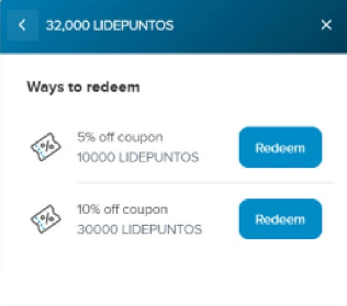 Son las recompensas que tienes disponibles para usar segun la cantidad de Lidepuntos que poseas. Al hacer click en "Redeem" se te otorgará un código que podrás aplicar en tu próxima orden de compra. En caso de no contar con los suficientes puntos, el botón "Redeem" no aparecerá.